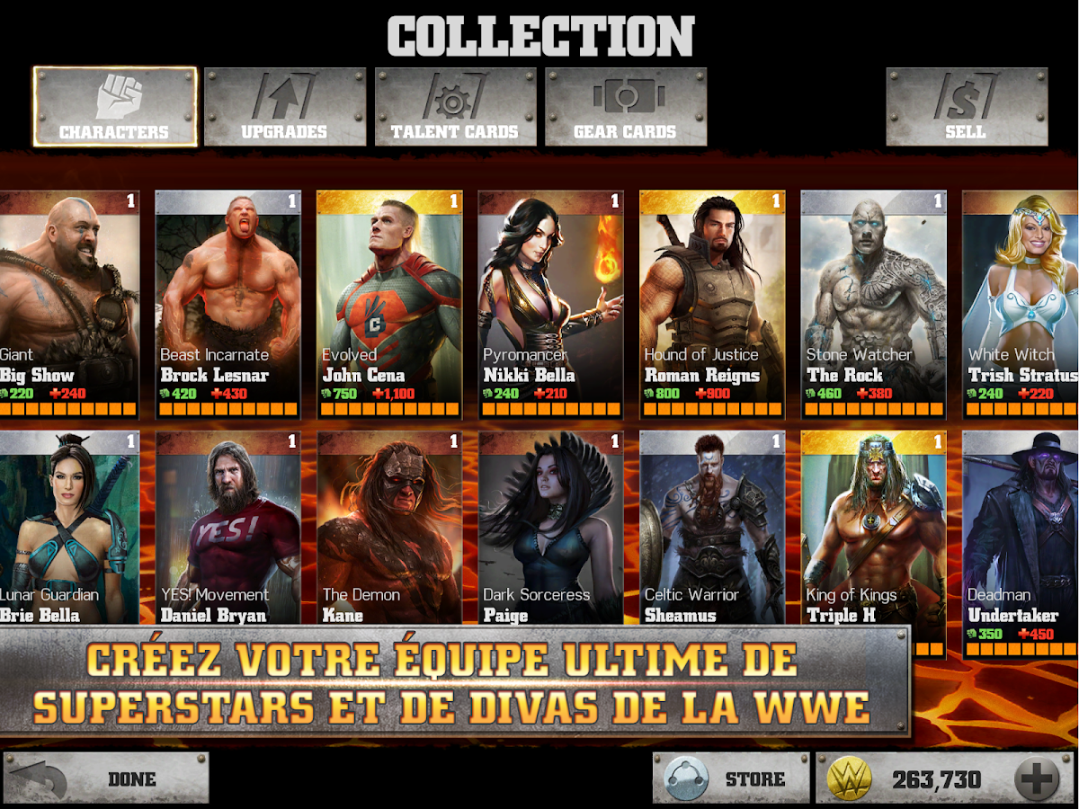 جمع واللعب إصدارات خيالية اعتبارا من المفضلة لديك WWE النجوم: تريبل اتش وجون سينا، متعهد، وبيلا التوائم، الصخرة، هوجان، وغيرها الكثير. كل نجم مبدع يأتي مع وجود اختلافات فريدة من نوعها، ويضم صلاحيات خاصة والتحركات.